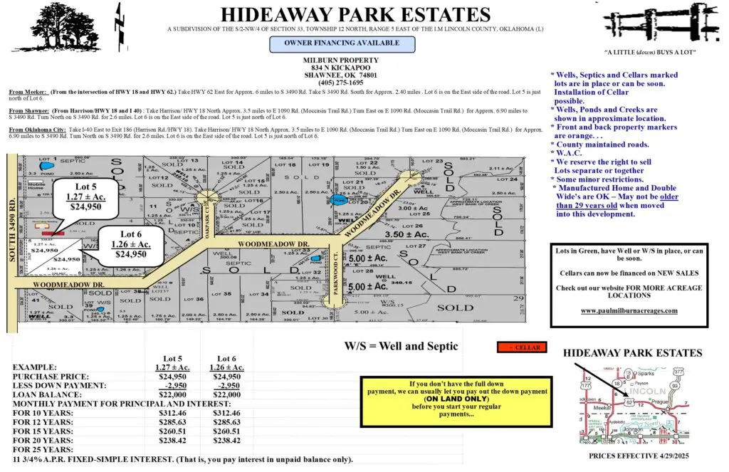 HIDEAWAY PARK ESTATES ∼ Rural Prague. Lots 5 & 6 are back on the market! Lots 5 & 6 are 1.27 ± Ac. each. Each lot is priced at $24,950 with $2,950 down. Monthly payments as low as $238.42. Give us a call today!