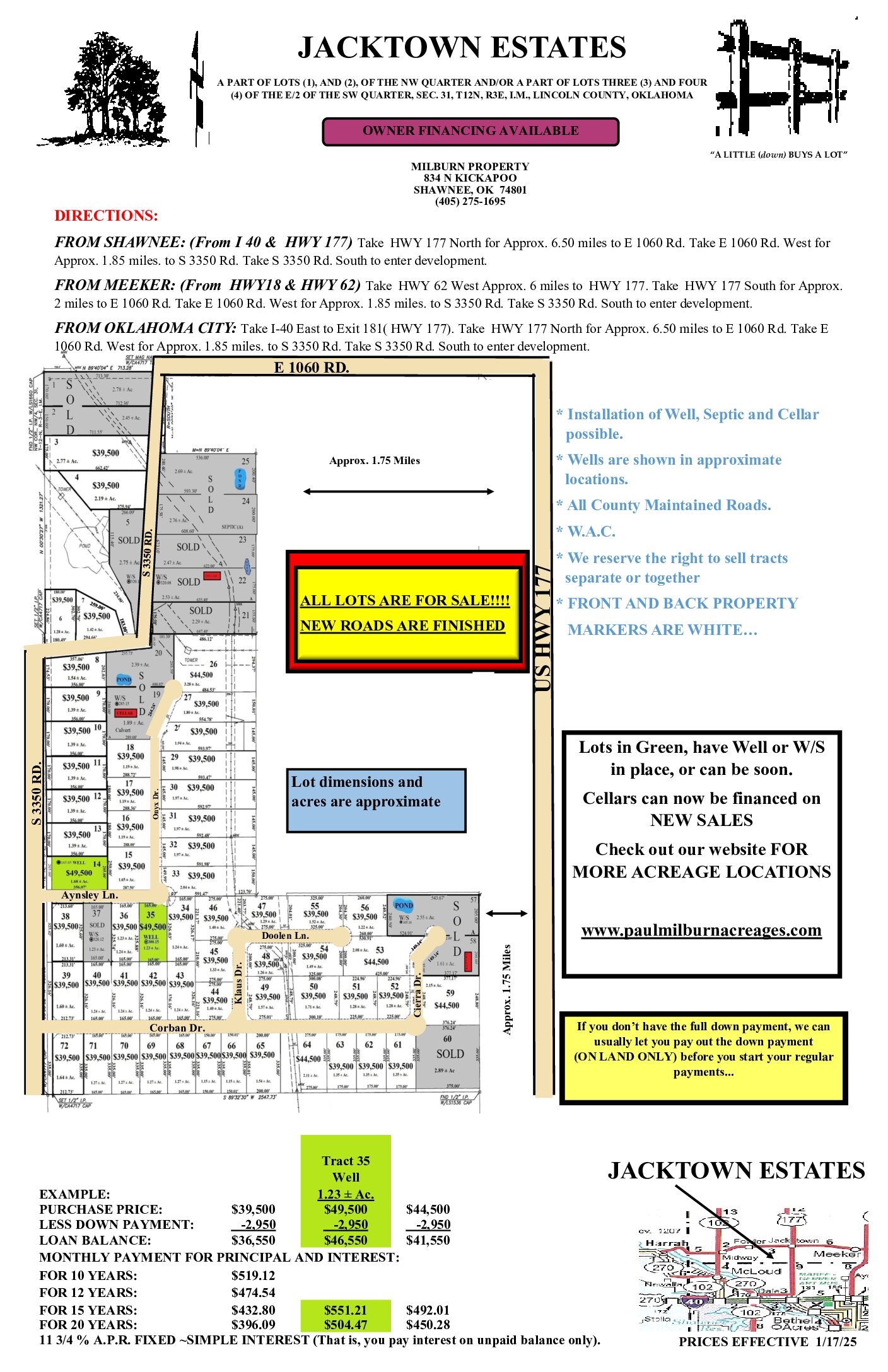 New Development in rural McLoud. Available lots range in size from 1.39 ± to 3.38 ± Ac. Priced at $39,500. Down payment of $2950. Monthly payments as low as $396.09. Installation of Well (We do not furnish or Install pump or pressure tank), Septic & Storm Shelter